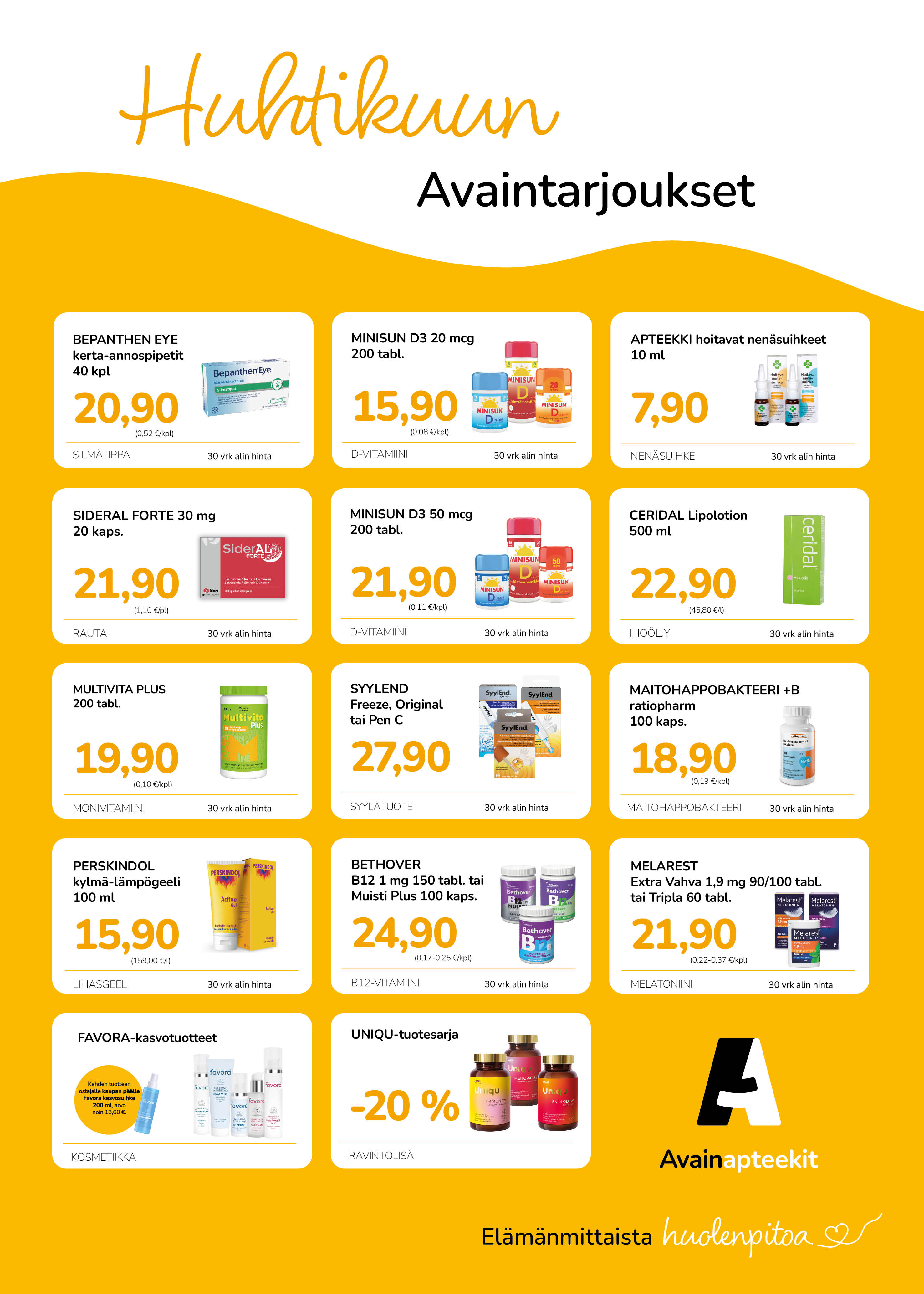 Kuulumme Avainapteekit-ketjuun! Liity avainasiakkaaksi täyttämällä liittymislomake asioidessasi apteekissa. Tarjoukset voimassa 1.4.-30.4.2026.